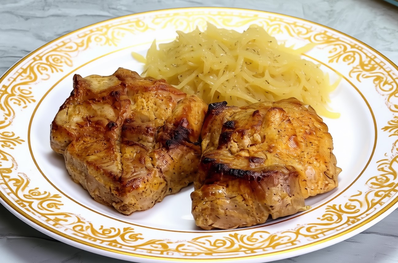 Получается сочная свиная шея вместе с гарниром из лука и капусты.