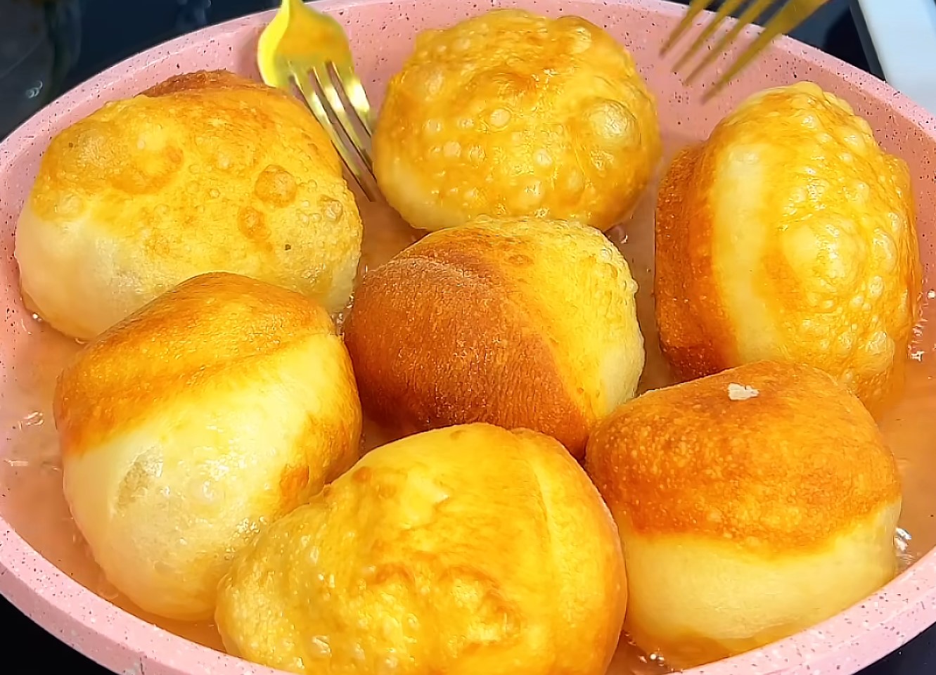 - Выкладываем в горячее масло будущие пышки и обжариваем с обеих сторон по 3-4 минуты до золотистого цвета.