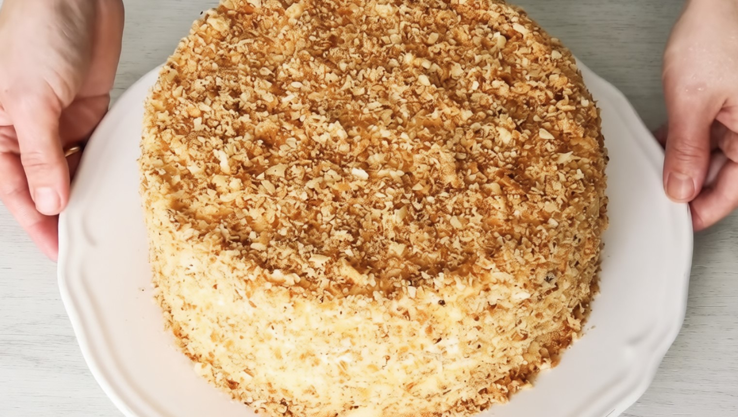 Смазываем бока и верхушку торта кремом, посыпаем измельченными обрезками от коржей. Получается нежный сладкий домашний торт “Наполеон”.