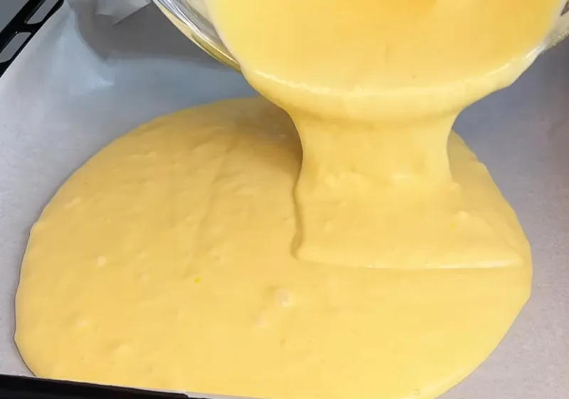 Застилаем противень пергаментом и выливаем на него тесто, выпекаем при 180 градусах 20-25 минут. Даем коржу остыть и делим его надвое, удаляем неровные края.