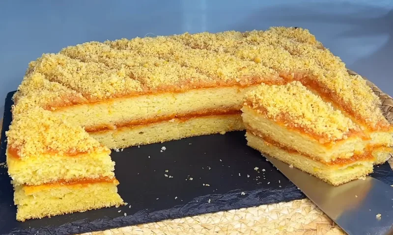 Второй корж тоже смазываем вареньем и посыпаем крошкой. Оставляем пирог в холодильнике на 1 час и подаем к столу.