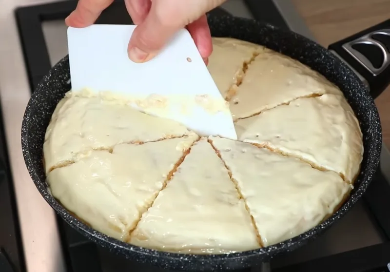 Если у сковороды нет хорошего антипригарного покрытия, можно смешать все ингредиенты отдельно. На сковороду в таком случае положите круг из пергамента.