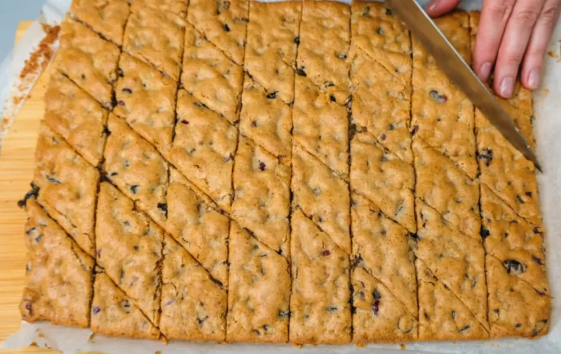 Застилаем противень пергаментом и распределяем по поверхности тесто. Выпекаем пласт при 180 градусах 15 минут, а затем горячий пласт нарезаем на небольшие квадратики или ромбики.
